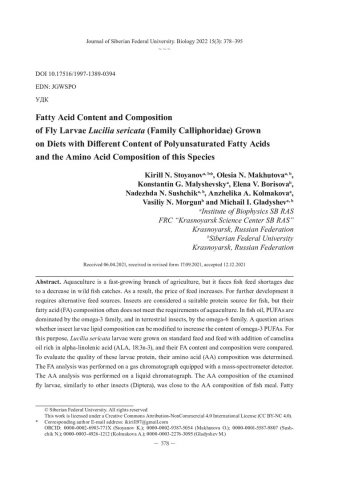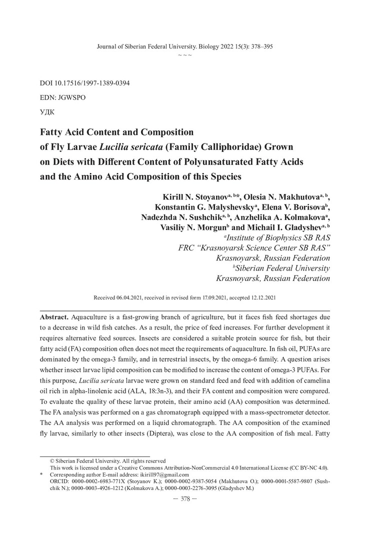 Библиографическое описание: Состав и содержание жирных кислот в личинках мух Lucilia sericata (сем. Calliphoridae), выращенных на кормах с разным содержанием полиненасыщенных жирных кислот, и особенности их аминокислотного состава = Fatty Acid Content and Composition of Fly Larvae Lucilia sericata (Family Calliphoridae) Grown on Diets with Different Content of Polyunsaturated Fatty Acids and the Amino Acid Composition of this Species / К. Н. Стоянов, О. Н. Махутова, К. Г. Малышевский [и др.]. - Текст : непосредственный // Журнал Сибирского федерального университета. Биология. - 2022. - Т. 15, № 3. - С. 378-395 : 4 рис.; табл. - Библиогр.: с. 393-395. - ISSN 1997-1389.