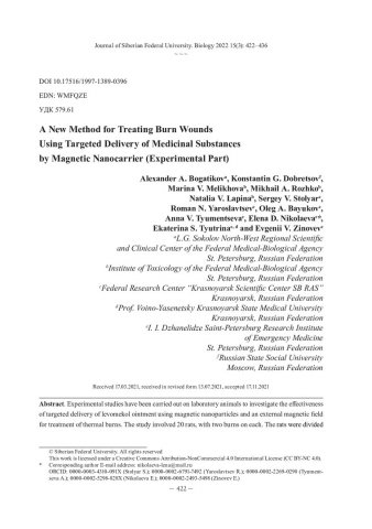 Библиографическое описание: Новый способ лечения ожоговых ран с помощью адресной доставки лекарственных веществ магнитным наноносителем (экспериментальная часть) = A New Method for Treating Burn Wounds Using Targeted Delivery of Medicinal Substances by Magnetic Nanocarrier (Experimental Part) / А. А. Богатиков, К. Г. Добрецов, М. В. Мелихова [и др.]. - Текст : непосредственный // Журнал Сибирского федерального университета. Биология. - 2022. - Т. 15, № 3. - С. 422-436 : 8 рис.; табл. - Библиогр.: с. 434-436. - ISSN 1997-1389.