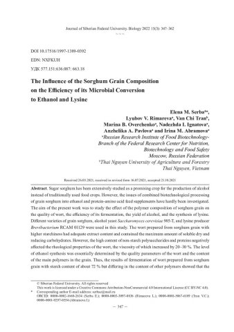 Библиографическое описание: Влияние особенностей состава зерна сорго на эффективность его микробной конверсии в этанол и лизин = The Influence of the Sorghum Grain Composition on the Efficiency of its Microbial Conversion to Ethanol and Lysine / Е. М. Серба, Л. В. Римарева, В. Т. Чан [и др.]. - Текст : непосредственный // Журнал Сибирского федерального университета. Биология. - 2022. - Т. 15, № 3. - С. 347-362 : 3 рис.; 4 табл. - Библиогр.: с. 358-362. - ISSN 1997-1389.