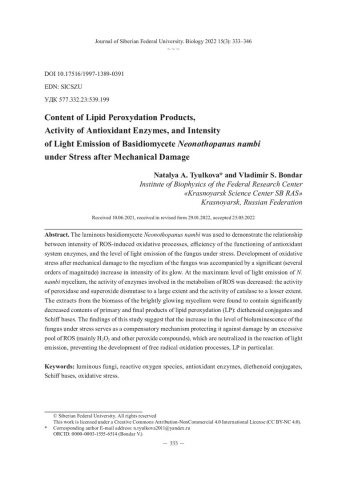 Библиографическое описание: Тюлькова, Н. А. Содержание продуктов перекисного окисления липидов, активность антиоксидантных ферментов и интенсивность световой эмиссии базидиомицета Neonothopanus nambi при стрессе после механического повреждения = Content of Lipid Peroxydation Products, Activity of Antioxidant Enzymes, and Intensity of Light Emission of Basidiomycete Neonothopanus nambi under Stress after Mechanical Damage / Н. А. Тюлькова, В. С. Бондарь. - Текст : непосредственный // Журнал Сибирского федерального университета. Биология. - 2022. - Т. 15, № 3. - С. 333-346 : 5 рис. - Библиогр.: с. 343-346. - ISSN 1997-1389.