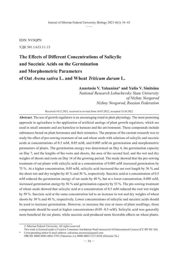 Библиографическое описание: Якунина, А. В. Влияние салициловой и янтарной кислот разных концентраций на всхожесть и морфометрические показатели растений овса посевного Avena sativa L. и пшеницы твёрдой Triticum durum L. = The Effects of Different Concentrations of Salicylic and Succinic Acids on the Germination and Morphometric Parameters of Oat Avena sativa L. and Wheat Triticum durum L. / А. В. Якунина, Ю. В. Синицына. - Текст : непосредственный // Журнал Сибирского федерального университета. Биология. - 2023. - Т. 16, № 1. - С. 54-63 : 6 табл. - Библиогр.: с. 62-63. - ISSN 1997-1389.