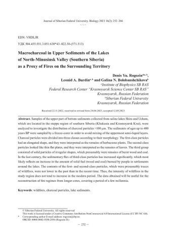 Библиографическое описание: Рогозин, Д. Ю. Угольные макрочастицы в верхних слоях донных отложений озёр Северо-Минусинской котловины (юг Сибири) как индикатор динамики пожаров на окружающей территории = Macrocharcoal in Upper Sediments of the Lakes of North-Minusinsk Valley (Southern Siberia) as a Proxy of Fires on the Surrounding Territory / Д. Ю. Рогозин, Л. А. Бурдин, Г. Н. Болобанщикова. - Текст : непосредственный // Журнал Сибирского федерального университета. Биология. - 2023. - Т. 16, № 2. - С. 252-266 : 6 рис. - Библиогр.: с. 264-266. - ISSN 1997-1389.