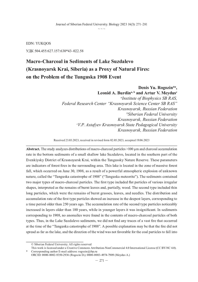 Библиографическое описание: Рогозин, Д. Ю. Угольные макрочастицы в донных отложениях озера Суздалево (Красноярский край, Эвенкия) как индикатор природных пожаров: к проблеме Тунгусской катастрофы 1908 г. = Macro-Charcoal in Sediments of Lake Suzdalevo (Krasnoyarsk Krai, Siberia) as a Proxy of Natural Fires: on the Problem of the Tunguska 1908 Event / Д. Ю. Рогозин, Л. А. Бурдин, А. В. Мейдус. - Текст : непосредственный // Журнал Сибирского федерального университета. Биология. - 2023. - Т. 16, № 3. - С. 271-281 : 3 рис. - Библиогр.: с. 280-281. - ISSN 1997-1389.