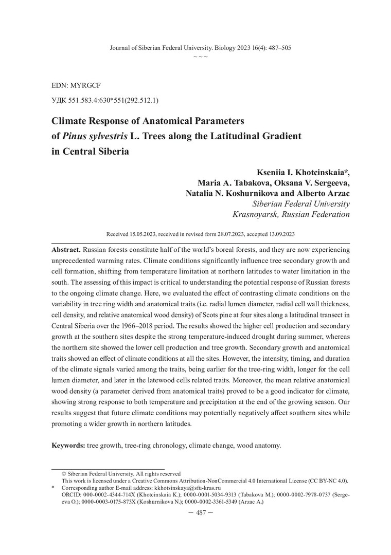 Библиографическое описание: Климатический отклик анатомических параметров древесины Pinus sylvestris L. вдоль широтного градиента в Центральной Сибири = Climate Response of Anatomical Parameters of Pinus sylvestris L. Trees along the Latitudinal Gradient in Central Siberia / К. И. Хоцинская, М. А. Табакова, О. В. Сергеева [и др.]. - Текст : непосредственный // Журнал Сибирского федерального университета. Биология. - 2023. - Т. 16, № 4. - С. 487-505. - Библиогр.: с. 501-505. - ISSN 1997-1389.