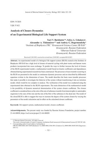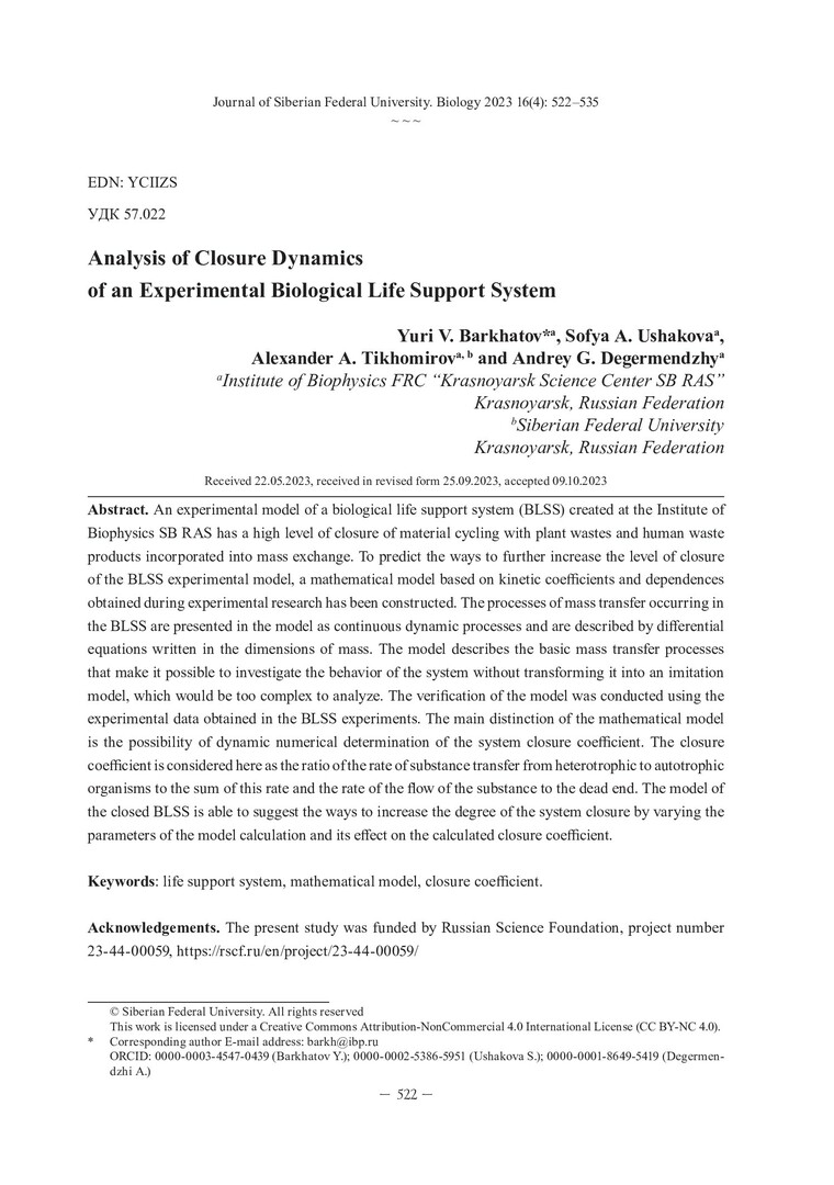 Библиографическое описание: Анализ динамики замкнутости массообменных процессов в экспериментальной модели биологической системы жизнеобеспечения = Analysis of Closure Dynamics of an Experimental Biological Life Support System / Ю. В. Бархатов, С. А. Ушакова, А. А. Тихомиров, А. Г. Дегерменджи. - Текст : непосредственный // Журнал Сибирского федерального университета. Биология. - 2023. - Т. 16, № 4. - С. 522-535. - Библиогр.: с. 533-535. - ISSN 1997-1389.