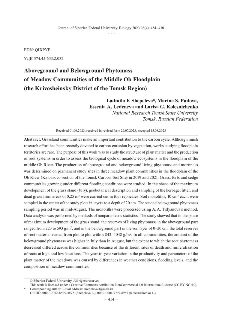 Библиографическое описание: Надземная и подземная фитомассы луговых сообществ поймы Средней Оби (Кривошеинский район Томской области) = Aboveground and Belowground Phytomass of Meadow Communities of the Middle Ob Floodplain (the Krivosheinsky District of the Tomsk Region) / Л. Ф. Шепелева, М. С. Пудова, Е. А. Леденева, Л. Г. Колесниченко. - Текст : непосредственный // Журнал Сибирского федерального университета. Биология. - 2023. - Т. 16, № 4. - С. 454-470. - Библиогр.: с. 467-470. - ISSN 1997-1389.