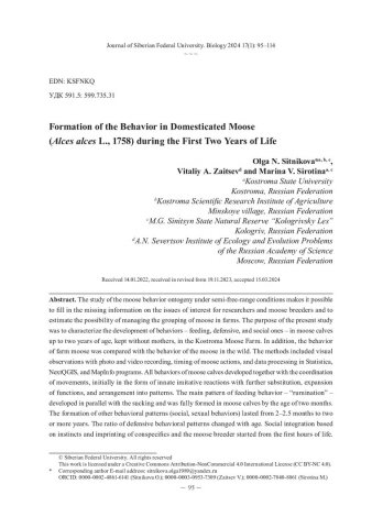 Библиографическое описание: Ситникова, О. Н. Формирование поведения одомашниваемых лосей (Alces alces L., 1758) до двух лет жизни = Formation of the Behavior in Domesticated Moose (Alces alces L., 1758) during the First Two Years of Life / О. Н. Ситникова, В. А. Зайцев, М. В. Сиротина. - Текст : непосредственный // Журнал Сибирского федерального университета. Биология. - 2024. - Т. 17, № 1. - С. 95-114 : 2 рис.; 5 табл. - Библиогр.: с. 111-114. - ISSN 1997-1389.