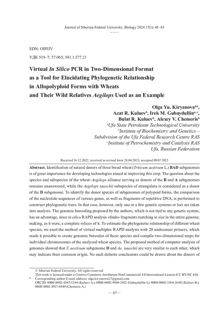 Библиографическое описание: Виртуальная in silico ПЦР в двумерном формате как инструмент для выяснения филогенетического родства у аллополиплоидных форм на примере пшениц и их диких сородичей эгилопсов = Virtual In Silico PCR in Two-Dimensional Format as a Tool for Elucidating Phylogenetic Relationship in Allopolyploid Forms with Wheats and Their Wild Relatives Aegilops Used as an Example / О. Ю. Кирьянова, А. Р. Кулуев, И. М. Губайдуллин [и др.]. - Текст : непосредственный // Журнал Сибирского федерального университета. Биология. - 2024. - Т. 17, № 1. - С. 45-63 : 6 рис.; 5 табл. - Библиогр.: с. 62-63. - ISSN 1997-1389.