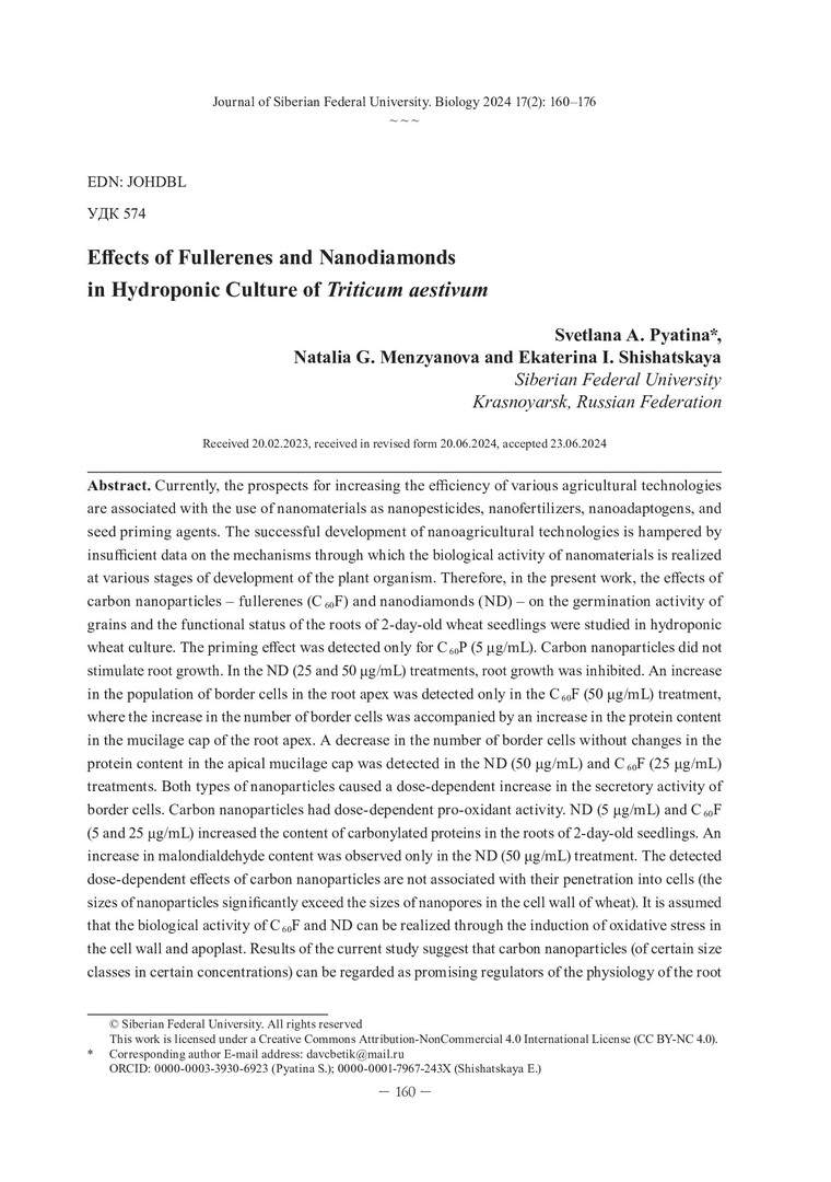Библиографическое описание: Пятина, С. А. Эффекты фуллеренов и наноалмазов в гидропонной культуре Triticum aestivum = Effects of Fullerenes and Nanodiamonds in Hydroponic Culture of Triticum aestivum / С. А. Пятина, Н. Г. Мензянова, Е. И. Шишацкая. - Текст : непосредственный // Журнал Сибирского федерального университета. Биология. - 2024. - Т. 17, № 2. - С. 160-176 : 4 рис.: табл. - Библиогр.: с. 172-176. - ISSN 1997-1389.