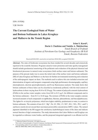 Библиографическое описание: Korol, Irina S... The Current Ecological State of Water and Bottom Sediments in Lakes Krugloye and Maltsevo in the Tomsk Region = Первичная оценка экологического состояния вод и донных отложений озер Круглое и Мальцево Томской области / I. S. Korol, D. I. Chuikina, N. A. Mukhortina. - Текст : непосредственный // Журнал Сибирского федерального университета. Биология. - 2024. - Т. 17, № 2. - С. 211-224 : рис.; 4 табл. - Библиогр.: с. 222-224. - ISSN 1997-1389.
