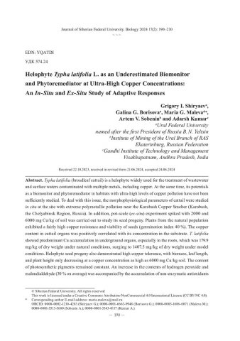 Библиографическое описание: Helophyte Typha latifolia L. as an Underestimated Biomonitor and Phytoremediator at Ultra-High Copper Concentrations: An In- Situ and Ex- Situ Study of Adaptive Responses = Гелофит Typha latifolia L. как недооцененный биомонитор и фиторемедиатор при сверхвысоком содержании меди: исследование адаптивных реакций in-situ и ex-situ / G. I. Shiryaev, G. G. Borisova, M. G. Maleva [et al.]. - Текст : непосредственный // Журнал Сибирского федерального университета. Биология. - 2024. - Т. 17, № 2. - С. 190-210 : 5 рис.; 4 табл. - Библиогр.: с. 206-210. - ISSN 1997-1389.