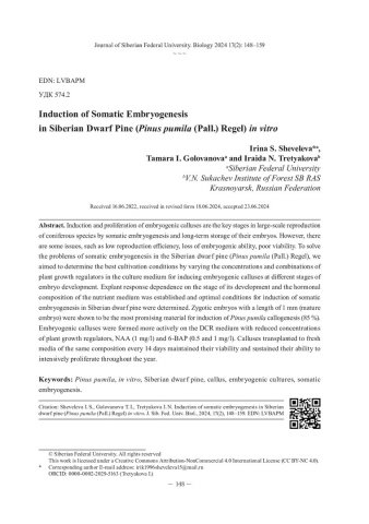 Библиографическое описание: Шевелева, И. С. Индукция соматического эмбриогенеза у кедрового стланика (Pinus pumila (Pall.) Regel) в культуре in vitro = Induction of Somatic Embryogenesis in Siberian Dwarf Pine (Pinus pumila (Pall.) Regel) in vitro / И. С. Шевелева, Т. И. Голованова, И. Н. Третьякова. - Текст : непосредственный // Журнал Сибирского федерального университета. Биология. - 2024. - Т. 17, № 2. - С. 148-159 : 3 рис.; 2 табл. - Библиогр.: с. 157-159. - ISSN 1997-1389.