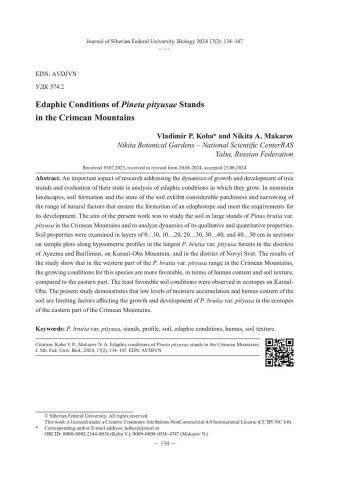 Библиографическое описание: Коба, В. П. Эдафические условия насаждений Pineta pityusae Горного Крыма = Edaphic Conditions of Pineta pityusae Stands in the Crimean Mountains / В. П. Коба, Н. А. Макаров. - Текст : непосредственный // Журнал Сибирского федерального университета. Биология. - 2024. - Т. 17, № 2. - С. 134-147 : рис.; 4 табл. - Библиогр.: с. 145-147. - ISSN 1997-1389.