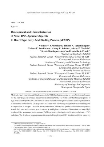 Библиографическое описание: Development and Characterization of Novel DNA Aptamers Specific to Heart-Type Fatty Acid Binding Protein (hFABP) = Получение и свойства ДНК‑аптамеров к сердечному белку, связывающему жирные кислоты (кардиоБСЖК) / V. V. Krasitskaya, T. A. Vereshchagina, T. E. Smoliarova [et al.]. - Текст : непосредственный // Журнал Сибирского федерального университета. Биология. - 2024. - Т. 17, № 3. - С. 302-319 : 6 рис.; 2 табл. - Библиогр.: с. 317-319. - ISSN 1997-1389.