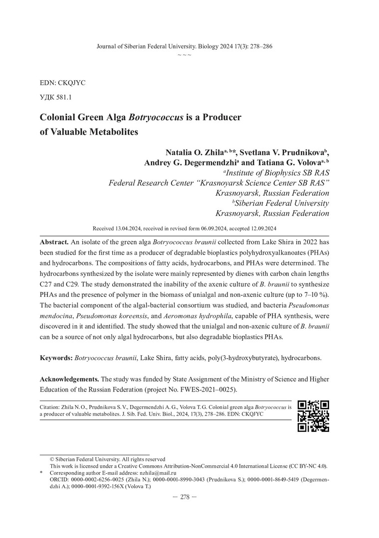 Библиографическое описание: Зеленая колониальная водоросль Botryococcus – продуцент ценных метаболитов = Colonial Green Alga Botryococcus is a Producer of Valuable Metabolites / Н. О. Жила, С. В. Прудникова, А. Г. Дегерменджи, Т. Г. Волова. - Текст : непосредственный // Журнал Сибирского федерального университета. Биология. - 2024. - Т. 17, № 3. - С. 278-286 : 3 рис. - Библиогр.: с. 285-286. - ISSN 1997-1389.