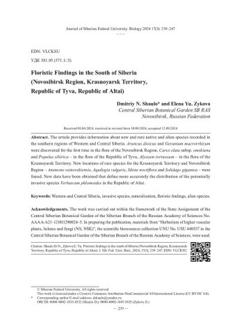 Библиографическое описание: Шауло, Д. Н. Флористические находки на юге Сибири (Новосибирская область, Красноярский край, Республики Тыва и Алтай) = Floristic Findings in the South of Siberia (Novosibirsk Region, Krasnoyarsk Territory, Republic of Tyva, Republic of Altai) / Д. Н. Шауло, Е. Ю. Зыкова. - Текст : непосредственный // Журнал Сибирского федерального университета. Биология. - 2024. - Т. 17, № 3. - С. 239-247. - Библиогр.: с. 244-247. - ISSN 1997-1389.