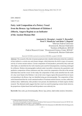 Библиографическое описание: Жирнокислотный состав керамического сосуда стоянки бронзового века Ельчимо-1 (Сибирь, Приангарье) как индикатор пищевого рациона древнего человека = Fatty Acid Composition of a Pottery Vessel from the Bronze Age Settlement of Elchimo-1 (Siberia, Angara Region) as an Indicator of the Ancient Human Diet / А. К. Округина, А. Н. Бояндин, П. В. Мандрыка, Д. Ю. Рогозин. - Текст : непосредственный // Журнал Сибирского федерального университета. Биология. - 2024. - Т. 17, № 3. - С. 337-347 : 4 рис.; табл. - Библиогр.: с. 345-347. - ISSN 1997-1389.
