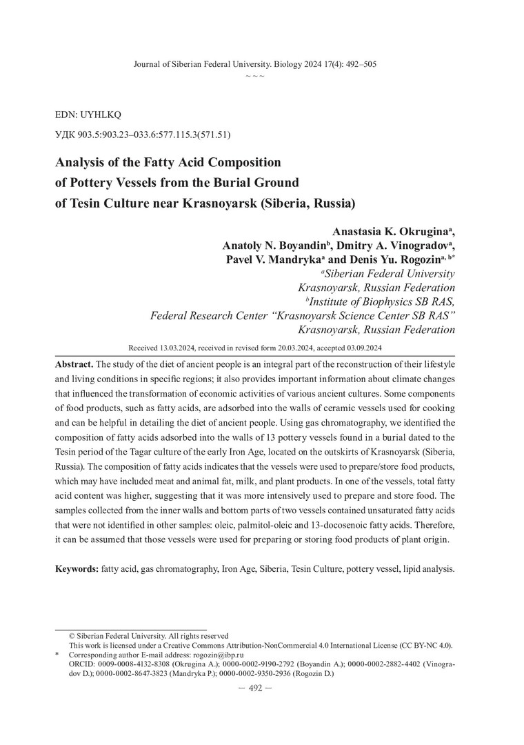 Библиографическое описание: Анализ жирнокислотного состава керамических сосудов из погребения тесинской культуры в окрестностях г. Красноярска = Analysis of the Fatty Acid Composition of Pottery Vessels from the Burial Ground of Tesin Culture near Krasnoyarsk (Siberia, Russia) / А. К. Округина, А. Н. Бояндин, Д. А. Виноградов [и др.]. - Текст : непосредственный // Журнал Сибирского федерального университета. Биология. - 2024. - Т. 17, № 4. - С. 492-505 : 9 рис.; табл. - Библиогр.: с. 504-505. - ISSN 1997-1389.