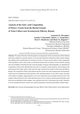 Аннотация: Изучение диеты древних людей является неотъемлемой частью реконструкции их образа жизни и условий проживания в конкретных регионах, а также предоставляет важные сведения об изменениях климата, которые влияли на трансформацию видов хозяйственной деятельности различных древних культур. Некоторые компоненты пищевых продуктов, такие как жирные кислоты, адсорбируются в стенки керамических сосудов, используемых для приготовления пищи, и могут применяться для детализации диеты древних людей. С помощью газовой хроматографии нами выявлен состав жирных кислот, адсорбированных в стенки 13 глиняных сосудов, найденных в захоронении тесинской культуры раннего железного века на территории г. Красноярска. Состав жирных кислот указывает на то, что в сосудах готовили/хранили продукты, в число которых возможно входили мясо и жир животных, молоко, а также продукты растительного происхождения. Один из сосудов отличался преобладающим общим содержанием жирных кислот, что позволяет предположить более интенсивное использование емкости в приготовлении и/или хранении пищи. На внутренних стенках и донных частях двух сосудов выявлены ненасыщенные кислоты, которые отсутствовали в прочих образцах: олеиновая, пальмито- олеиновая и эруковая. Следовательно, можно предполагать, что данные емкости использовались для приготовления или хранения продуктов растительного происхождения.