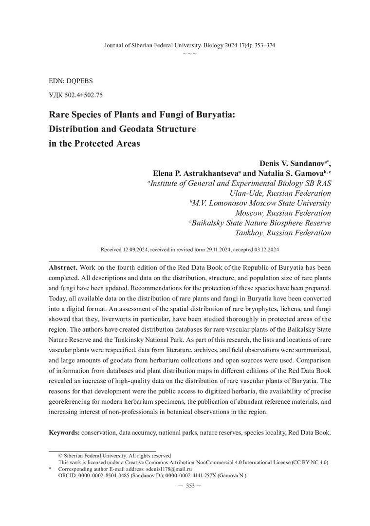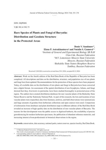 Библиографическое описание: Санданов, Д. В. Редкие виды растений и грибов Бурятии: распространение и структура геоданных на особо охраняемых природных территориях = Rare Species of Plants and Fungi of Buryatia: Distribution and Geodata Structure in the Protected Areas / Д. В. Санданов, Е. П. Астраханцева, Н. С. Гамова. - Текст : непосредственный // Журнал Сибирского федерального университета. Биология. - 2024. - Т. 17, № 4. - С. 353-374 : 4 рис.; 3 табл. - Библиогр.: с. 368-374. - ISSN 1997-1389.