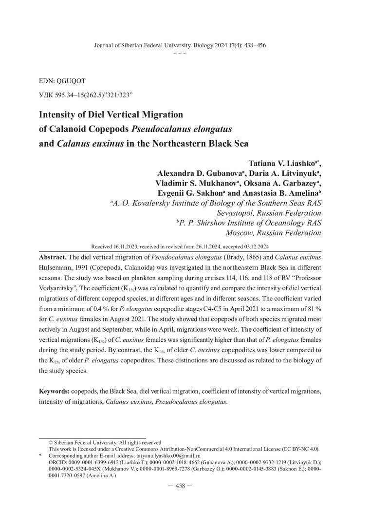 Библиографическое описание: Интенсивность суточных вертикальных миграций каляноидных копепод Pseudocalanus elongatus и Calanus euxinus в северо-восточной части Черного моря = Intensity of Diel Vertical Migration of Calanoid Copepods Pseudocalanus elongatus and Calanus euxinus in the Northeastern Black Sea / Т. В. Ляшко, А. Д. Губанова, Д. А. Литвинюк [и др.]. - Текст : непосредственный // Журнал Сибирского федерального университета. Биология. - 2024. - Т. 17, № 4. - С. 438-456 : 4 рис.; 2 табл. - Библиогр.: с. 452-456. - ISSN 1997-1389.