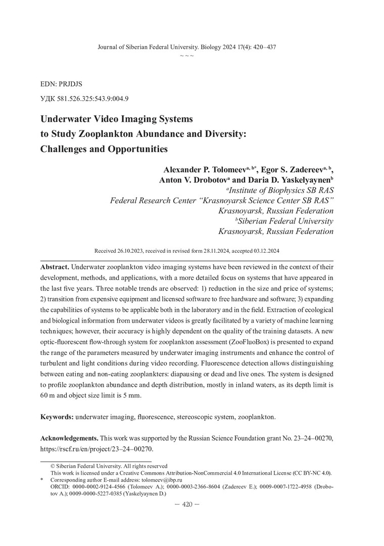 Библиографическое описание: Underwater Video Imaging Systems to Study Zooplankton Abundance and Diversity: Challenges and Opportunities = Системы подводной видеосъемки для изучения численности и разнообразия зоопланктона: проблемы и возможности / A. P. Tolomeev, E. S. Zadereev, A. V. Drobotov, D. D. Yaskelyaynen. - Текст : непосредственный // Журнал Сибирского федерального университета. Биология. - 2024. - Т. 17, № 4. - С. 420-437 : 2 рис.; табл. - Библиогр.: с. 434-437. - ISSN 1997-1389.