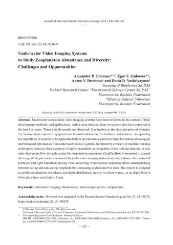 Аннотация: Системы подводной видеосъемки зоопланктона рассмотрены в контексте их развития, методов и областей применения. Отдельное внимание уделено системам, появившимся в последние пять лет. Наблюдаются три заметные тенденции: 1) уменьшение размеров и стоимости систем; 2) переход от дорогостоящего оборудования и лицензионного программного обеспечения к бесплатному оборудованию и программному обеспечению; 3) расширение возможностей систем для применения как в лабораторных, так и в полевых условиях. Извлечение экологической и биологической информации из подводных видеозаписей значительно облегчают различные методы машинного обучения, однако их точность сильно зависит от качества обучающих наборов данных. Представлена новая оптико-флуоресцентная проточная система для оценки зоопланктона (ZooFluoBox), позволяющая расширить спектр измеряемых параметров подводных приборов и обеспечить контроль турбулентных и световых условий при видеосъемке. Детекция флуоресценции позволяет различать питающихся и не питающихся (диапаузирующих или мертвых) зоопланктеров. Система предназначена для изучения зоопланктона, преимущественно во внутренних водоемах, поскольку ее возможности ограничены глубинами до 60 м и размерами объектов до 5 мм.