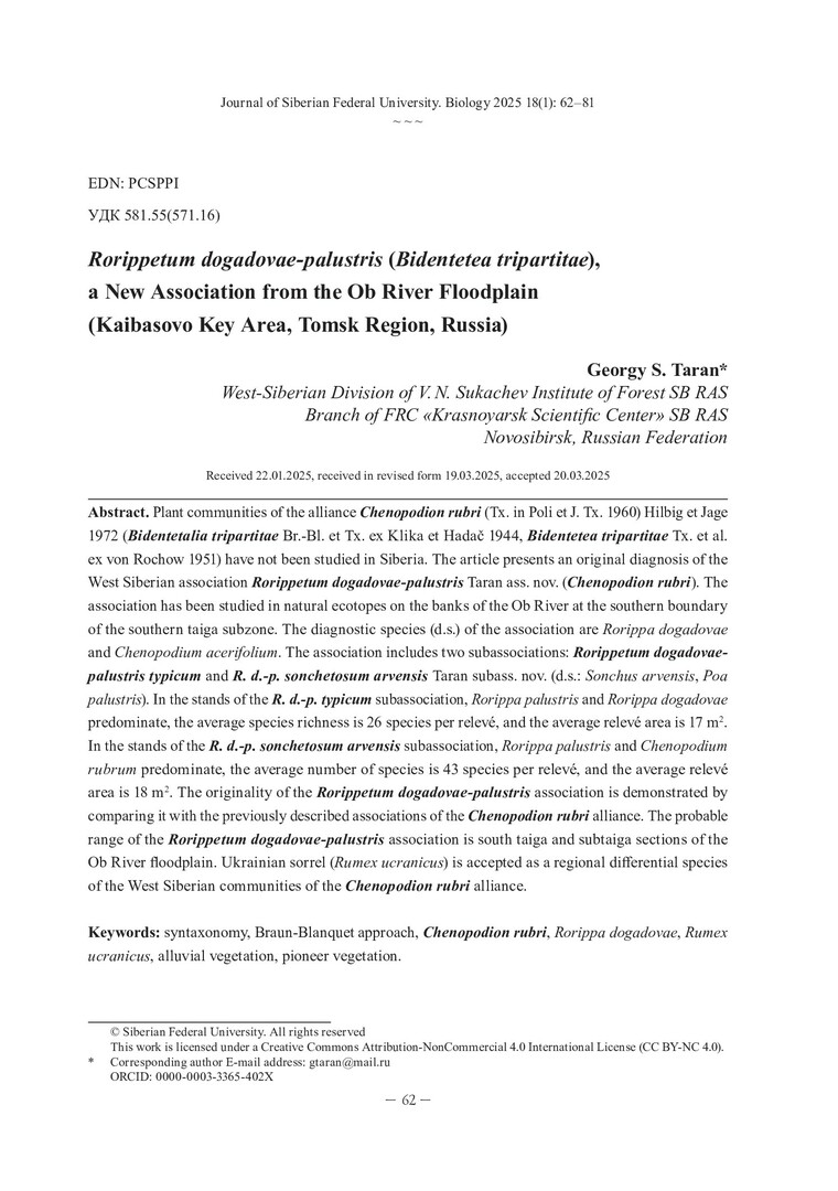 Библиографическое описание: Таран, Г. С. Rorippetum dogadovae-palustris (Bidentetea tripartitae), новая ассоциация из поймы реки Оби (ключевой участок Кайбасово, Томская область, Россия) = Rorippetum dogadovae-palustris (Bidentetea tripartitae), a New Association from the Ob River Floodplain (Kaibasovo Key Area, Tomsk Region, Russia) / Г. С. Таран. - Текст : непосредственный // Журнал Сибирского федерального университета. Биология. - 2025. - Т. 18, № 1. - С. 62-81 : 2 рис.; 2 табл. - Библиогр.: с. 78-81. - ISSN 1997-1389.