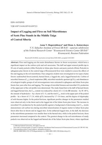 Библиографическое описание: Богородская, А. В. Воздействие рубок и пожаров на микробиомы почв сосняков среднетаежной подзоны Средней Сибири = Impact of Logging and Fires on Soil Microbiomes of Scots Pine Stands in the Middle Taiga of Central Siberia / А. В. Богородская, Е. А. Кукавская. - Текст : непосредственный // Журнал Сибирского федерального университета. Биология. - 2025. - Т. 18, № 1. - С. 22-44 : 6 рис.; табл. - Библиогр.: с. 39-44. - ISSN 1997-1389.