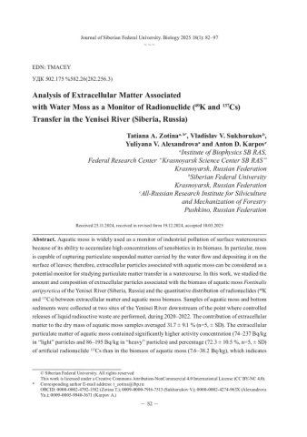 Анализ внеклеточного вещества, ассоциированного с водным мхом, как монитора переноса радионуклидов (40K и 137Cs) в р. Енисейстатья из журнала