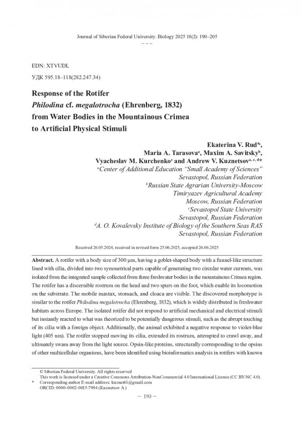 Библиографическое описание: Реакция коловратки Philodina cf. megalotrocha (Ehrenberg, 1832) из водоёмов горного Крыма на искусственные физические воздействия = Response of the Rotifer Philodina cf. megalotrocha (Ehrenberg, 1832) from Water Bodies in the Mountainous Crimea to Artificial Physical Stimuli / Е. В. Рудь, М. А. Тарасова, М. А. Савицкий [и др.]. - Текст : непосредственный // Журнал Сибирского федерального университета. Биология. - 2025. - Т. 18, № 2. - С. 190-205 : 6 рис.; 3 табл. - Библиогр.: с. 203-205. - ISSN 1997-1389.