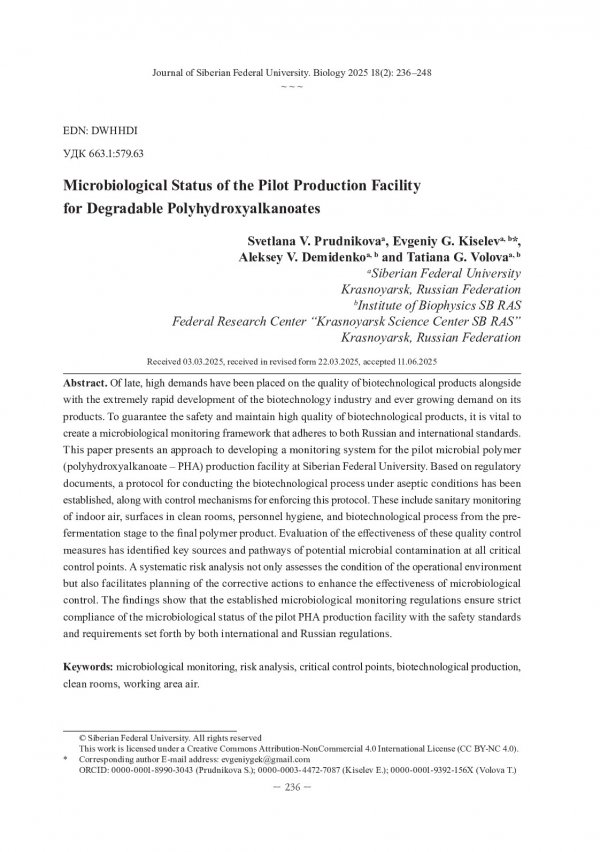 Библиографическое описание: Микробиологический статус Опытного биотехнологического производства разрушаемых полигидроксиалканоатов = Microbiological Status of the Pilot Production Facility for Degradable Polyhydroxyalkanoates / С. В. Прудникова, Е. Г. Киселев, А. В. Демиденко, Т. Г. Волова. - Текст : непосредственный // Журнал Сибирского федерального университета. Биология. - 2025. - Т. 18, № 2. - С. 236-248 : 4 рис.; 3 табл. - Библиогр.: с. 247-248. - ISSN 1997-1389.