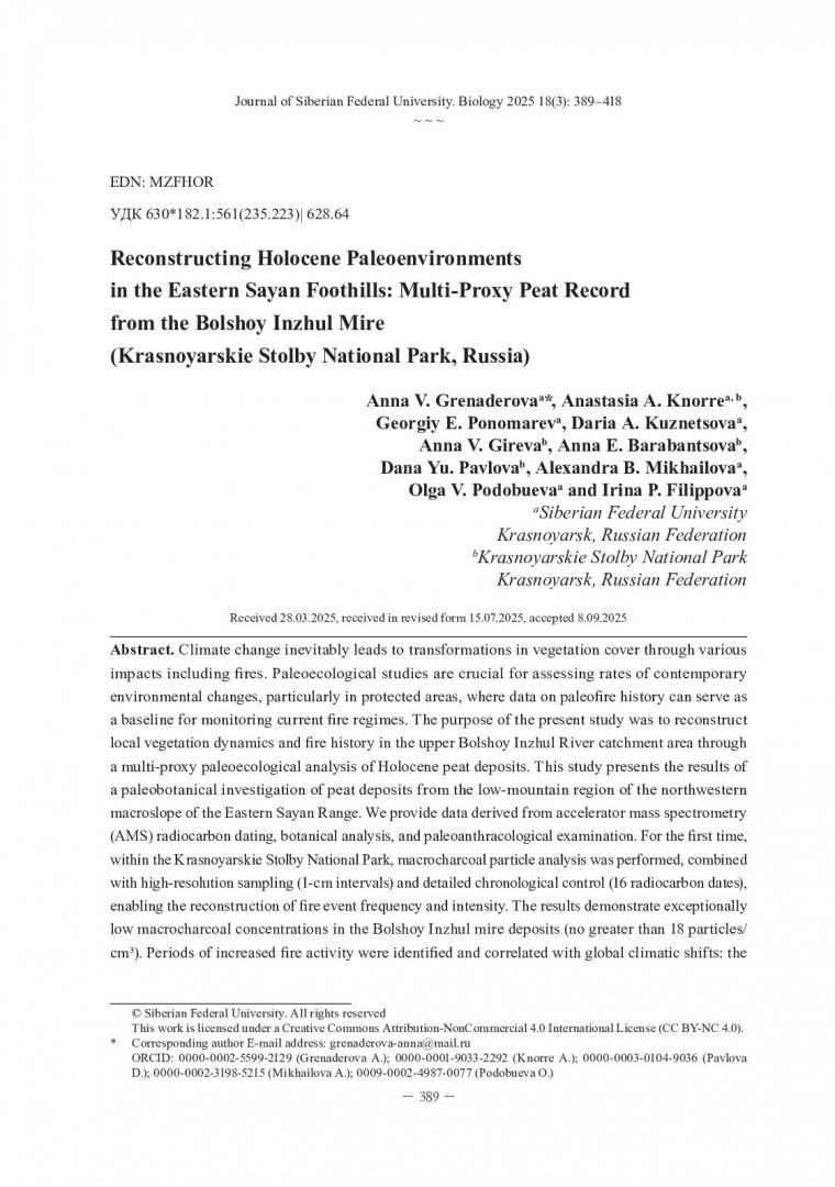 Библиографическое описание: Палеоэкологические условия в низкогорье Восточного Саяна в голоцене: по данным изучения болота в верховье р. Большой Инжул на территории национального парка "Красноярские Столбы" = Reconstructing Holocene Paleoenvironments in the Eastern Sayan Foothills: Multi-Proxy Peat Record from the Bolshoy Inzhul Mire (Krasnoyarskie Stolby National Park, Russia) / А. В. Гренадерова, А. А. Кнорре, Г. Е. Пономарев [и др.]. - Текст : непосредственный // Журнал Сибирского федерального университета. Биология. - 2025. - Т. 18, № 3. - С. 389-418 : 6 рис.; табл. - Библиогр.: с. 408-418. - ISSN 1997-1389.