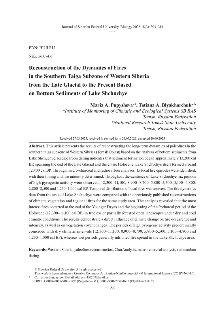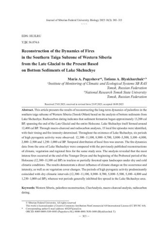 Библиографическое описание: Пупышева, М. А. Реконструкция динамики пожаров в южнотаежной подзоне Западной Сибири с позднеледниковья до современности (на примере отложений озера Щучье) = Reconstruction of the Dynamics of Fires in the Southern Taiga Subzone of Western Siberia from the Late Glacial to the Present Based on Bottom Sediments of Lake Shchuchye / М. А. Пупышева, Т. А. Бляхарчук. - Текст : непосредственный // Журнал Сибирского федерального университета. Биология. - 2025. - Т. 18, № 3. - С. 303-315 : 4 рис.; табл. - Библиогр.: с. 314-315. - ISSN 1997-1389.