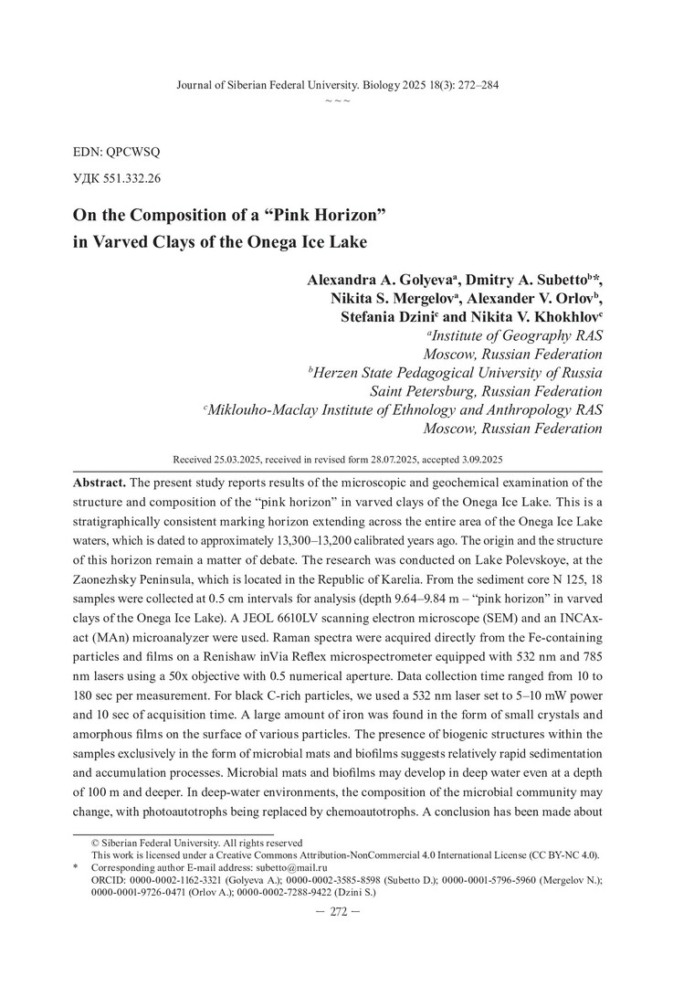 Библиографическое описание: К вопросу о составе "розового горизонта" в ленточных глинах Онежского приледникового озера = On the Composition of a “Pink Horizon” in Varved Clays of the Onega Ice Lake / А. А. Гольева, Д. А. Субетто, Н. С. Мергелов [и др.]. - Текст : непосредственный // Журнал Сибирского федерального университета. Биология. - 2025. - Т. 18, № 3. - С. 272-284 : 6 рис.; табл. - Библиогр.: с. 282-284. - ISSN 1997-1389.