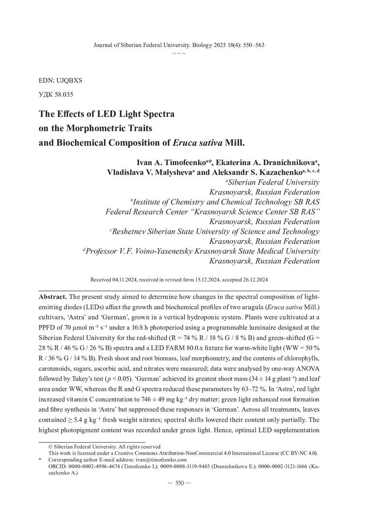 Библиографическое описание: Воздействие спектров излучения светодиодных ламп на морфологию и биохимический состав Eruca sativa Mill = The Effects of LED Light Spectra on the Morphometric Traits and Biochemical Composition of Eruca sativa Mill / И. А. Тимофеенко, Е. А. Драничникова, В. В. Малышева, А. С. Казаченко. - Текст : непосредственный // Журнал Сибирского федерального университета. Биология. - 2025. - Т. 18, № 4. - С. 550-563 : 4 рис. - Библиогр.: с. 561-563. - ISSN 1997-1389.