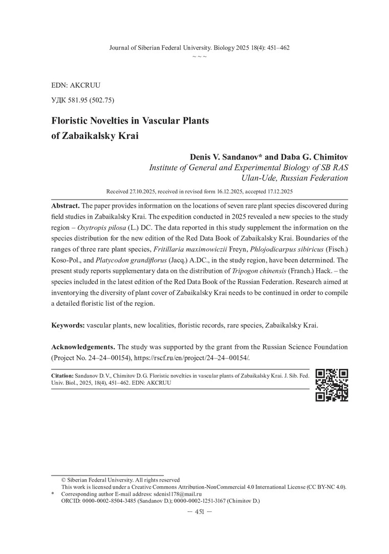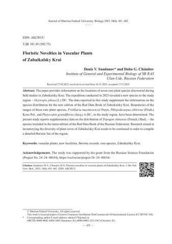 Библиографическое описание: Санданов, Д. В. Флористические находки сосудистых растений на территории Забайкальского края = Floristic Novelties in Vascular Plants of Zabaikalsky Krai / Д. В. Санданов, Д. Г. Чимитов. - Текст : непосредственный // Журнал Сибирского федерального университета. Биология. - 2025. - Т. 18, № 4. - С. 451-462 : 4 рис. - Библиогр.: с. 459-462. - ISSN 1997-1389.