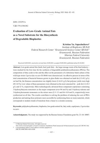 Библиографическое описание: Сапожникова, К. Ю. Оценка низкосортных животных жиров в качестве нового субстрата для биосинтеза разрушаемых биопластиков = Evaluation of Low-Grade Animal Fats as a Novel Substrate for the Biosynthesis of Degradable Bioplastics / К. Ю. Сапожникова. - Текст : непосредственный // Журнал Сибирского федерального университета. Биология. - 2025. - Т. 18, № 4. - С. 423-431 : 3 рис.; табл. - Библиогр.: с. 430-431. - ISSN 1997-1389.