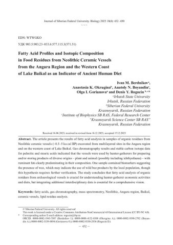 Библиографическое описание: Профиль и изотопный состав жирных кислот в пищевой корке керамических сосудов неолита Приангарья и западного побережья оз. Байкал как индикатор пищевого рациона древнего человека = Fatty Acid Profiles and Isotopic Composition in Food Residues from Neolithic Ceramic Vessels from the Angara Region and the Western Coast of Lake Baikal as an Indicator of Ancient Human Diet / И. М. Бердников, А. К. Округина, А. Н. Бояндин [и др.]. - Текст : непосредственный // Журнал Сибирского федерального университета. Биология. - 2025. - Т. 18, № 4. - С. 432-450 : 4 рис.; 4 табл. - Библиогр.: с. 446-450. - ISSN 1997-1389.
