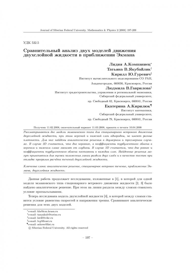 Библиографическое описание: Сравнительный анализ двух  моделей движения двухслойной жидкости в приближении Экмана = Comparative Analysis of Two Models of the Two-Layer Fluid Motion by means of Ekman’s Approximation / Л. А. Компаниец, Т. В. Якубайлик, К. Ю. Гуревич [и др.]. - Текст : непосредственный // Журнал Сибирского федерального университета. Математика и физика. - 2008. - Т. 1, № 2. - С. 197-209. - Библиогр.: с. 207-208 (13 назв.). - ISSN 1997-1397.