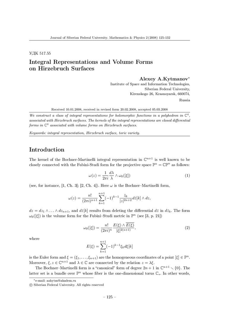 Библиографическое описание:Kytmanov, A. A. Integral Representations and Volume Forms on Hirzebruch Surfaces / A. A. Kytmanov. - Текст : непосредственный // Журнал Сибирского федерального университета. Математика и физика. - 2008. - Т. 1, № 2. - С. 125-132. - Библиогр.: с. 132 (8 назв.). - ISSN 1997-1397.