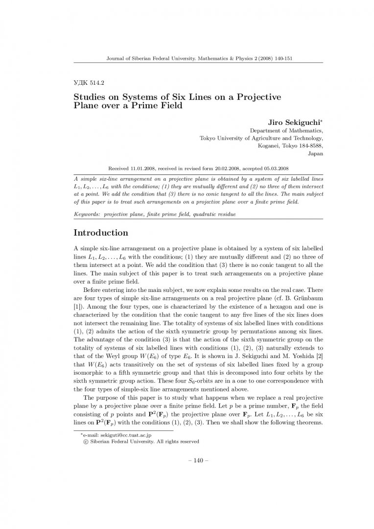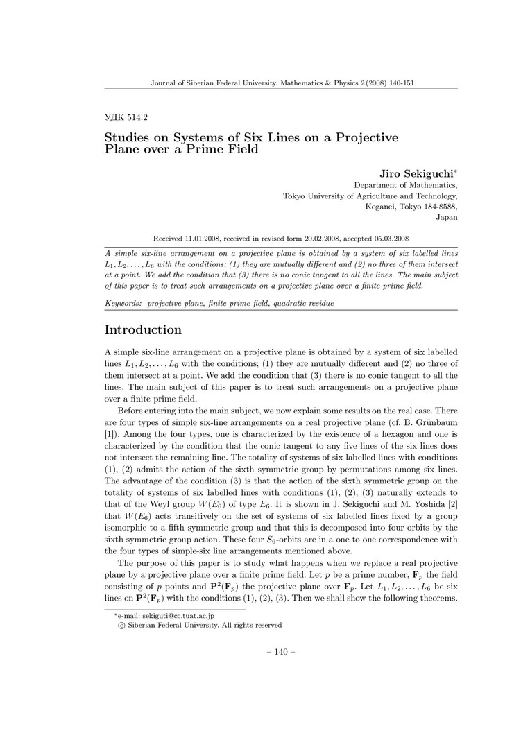 Библиографическое описание:Sekiguchi, Jiro. Studies on Systems of Six Lines on a Projective Plane over a Prime Field / Jiro Sekiguchi. - Текст : непосредственный // Журнал Сибирского федерального университета. Математика и физика. - 2008. - Т. 1, № 2. - С. 140-151. - Библиогр.: с. 151 (3 назв.). - ISSN 1997-1397.