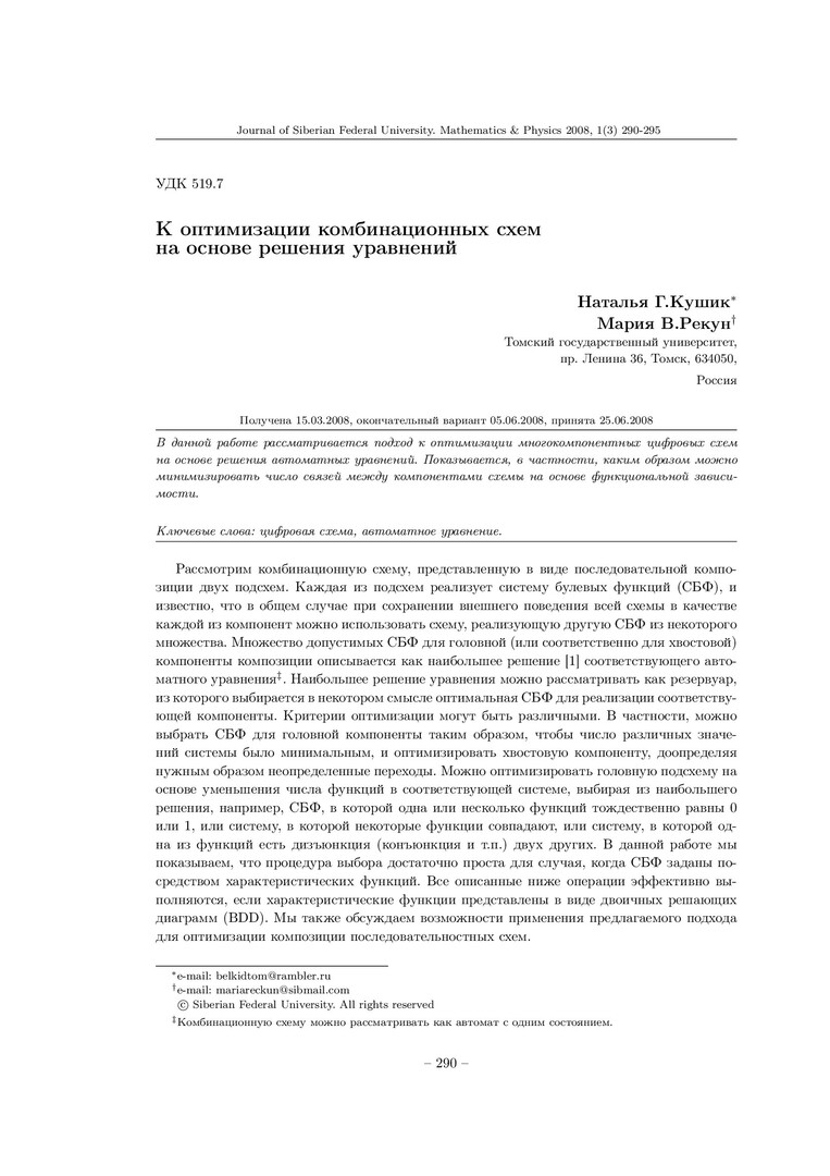 Библиографическое описание:Кушик, Н. Г. К оптимизации комбинационных схем на основе решения уравнений = On Digital Circuit Optimization Using Automata Equations / Н. Г. Кушик, М. В. Рекун. - Текст : непосредственный // Журнал Сибирского федерального университета. Математика и физика. - 2008. - Т. 1, № 3. - С. 290-295. - Библиогр.: с. 294-295 (5 назв.). - ISSN 1997-1397.