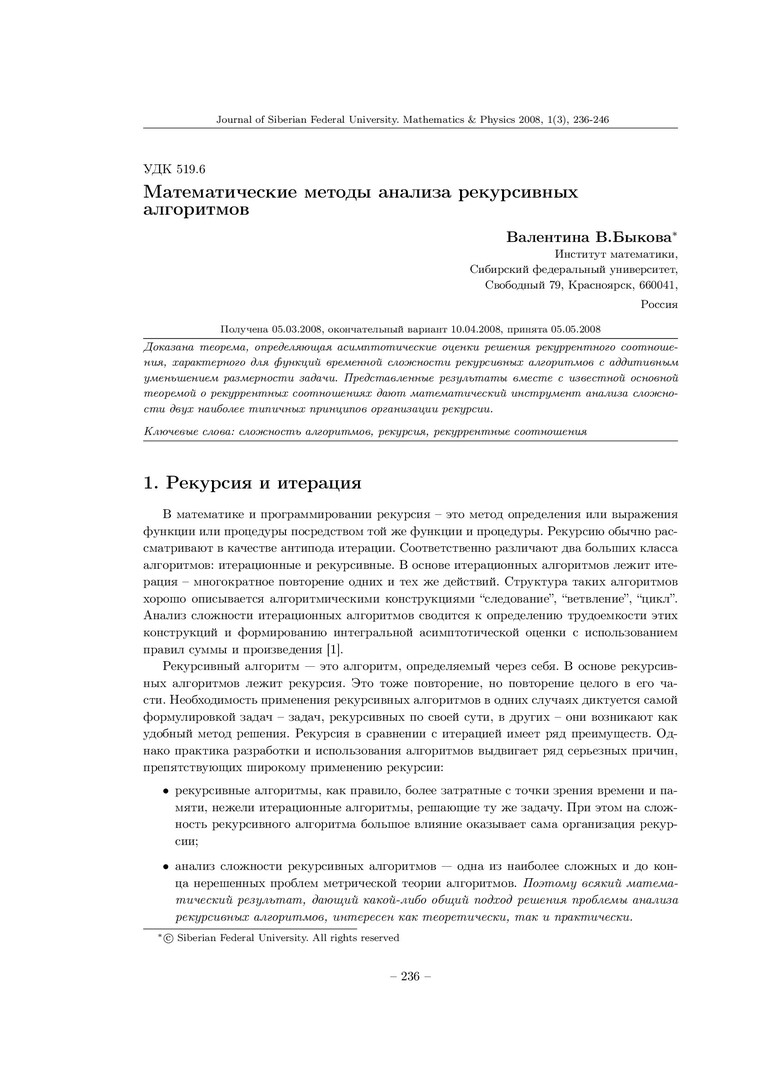 Библиографическое описание:Быкова, В. В. Математические методы анализа рекурсивных алгоритмов = Mathematical Methods for the Analysis of Recursive Algorithms / В. В. Быкова. - Текст : непосредственный // Журнал Сибирского федерального университета. Математика и физика. - 2008. - Т. 1, № 3. - С. 236-246. - Библиогр.: с. 245-246 (10 назв.). - ISSN 1997-1397.