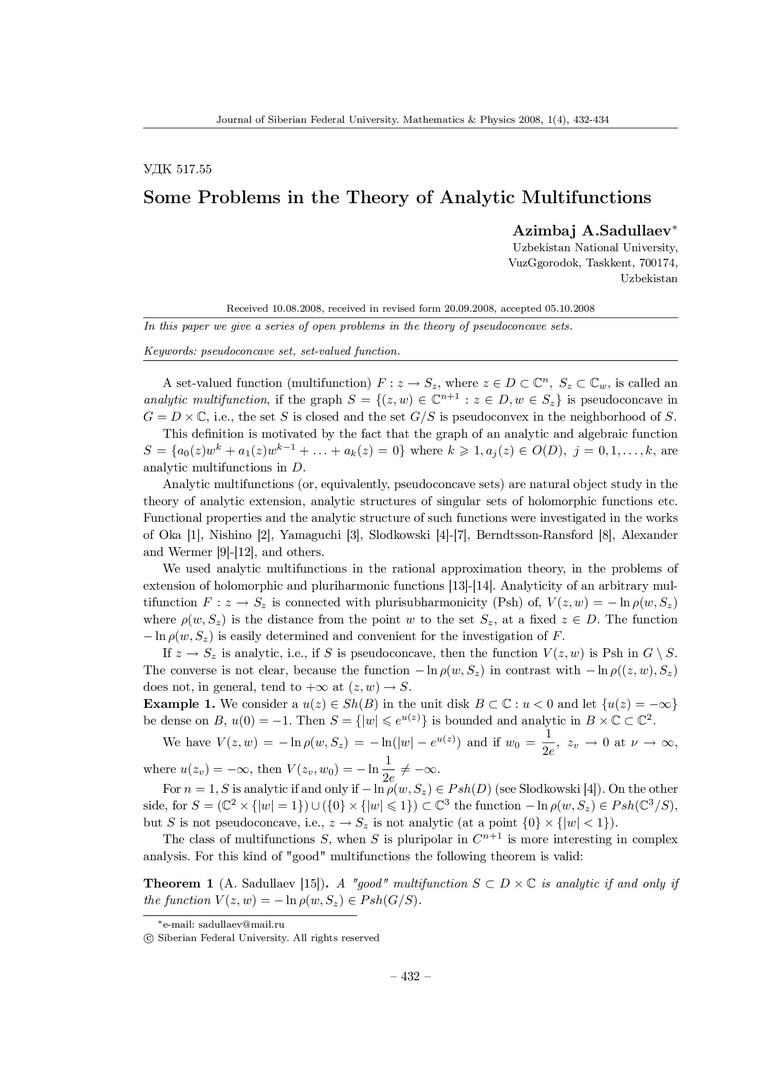 Библиографическое описание:Sadullaev, A. A. Some Problems in the Theory of Analytic Multifunctions / A. A. Sadullaev. - Текст : непосредственный // Журнал Сибирского федерального университета. Математика и физика. - 2008. - Т. 1, № 4. - С. 432-434. - Библиогр.: с. 433-434 (15 назв.). - ISSN 1997-1397.
