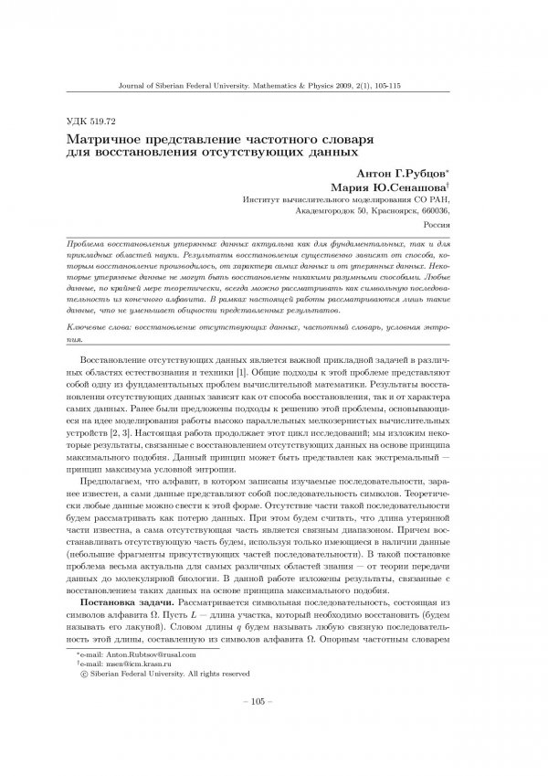 Библиографическое описание:Рубцов, Антон. Матричное представление частотного словаря для восстановления отсутствующих данных = Data Loss Recovery at Symbolic Sequences Due to Matrix Formulation of Frequency Dictionary / А. Г. Рубцов, М. Ю. Сенашова. - Текст : непосредственный // Журнал Сибирского федерального университета. Математика и физика. - 2009. - Т. 2, № 1. - С. 105-115. - Библиогр.: с. 115. - ISSN 1997-1397.