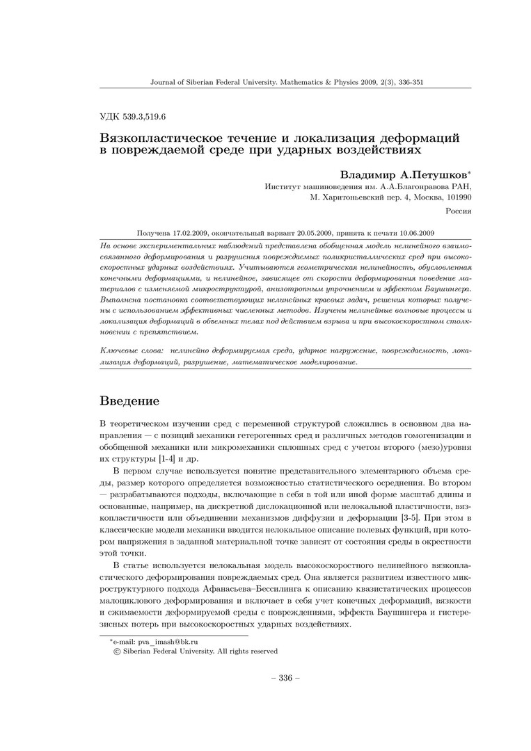 Библиографическое описание:Петушков, В. А. Вязкопластическое течение и локализация деформаций в повреждаемой среде при ударных воздействиях = Viscoplastic Flows and Strain Localization in a Damageable Medium under Impact Loading / В. А. Петушков. - Текст : непосредственный // Журнал Сибирского федерального университета. Математика и физика. - 2009. - Т. 2, № 3. - С. 336-351. - Библиогр.: с. 348-350. - ISSN 1997-1397.