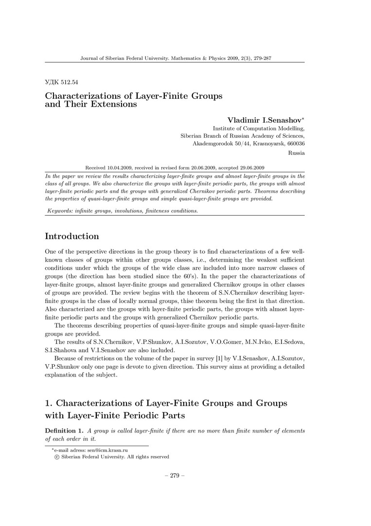 Библиографическое описание:Senashov, V. I. Сharacterizations of Layer-Finite Groups and Their Extensions = Характеристики слоисто-конечных групп и их расширений / V. I. Senashov. - Текст : непосредственный // Журнал Сибирского федерального университета. Математика и физика. - 2009. - Т. 2, № 3. - С. 279-287. - Библиогр.: с. 285-287. - ISSN 1997-1397.