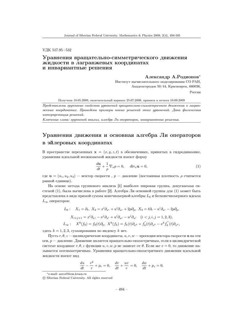 Аннотация:Представлены групповые свойства уравнений вращательно-симметричного движения в лагранжевых координатах. Приведены примеры новых решений этих уравнений. Дана физическая интерпретация решений.