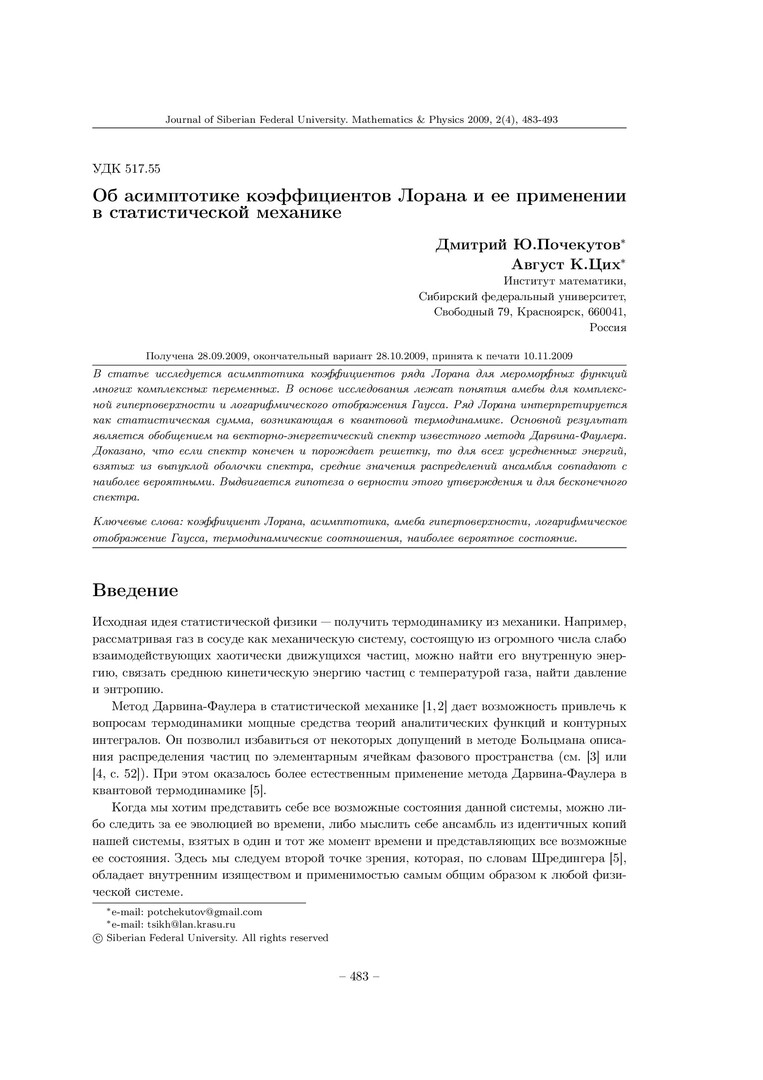Библиографическое описание:Почекутов, Д. Ю. Об асимптотике коэффициентов Лорана и ее применении в статистической механике = On the Asymptotics of Laurent Coefficients and its Application in Statistical Mechanics / Д. Ю. Почекутов, А. К. Цих. - Текст : непосредственный // Журнал Сибирского федерального университета. Математика и физика. - 2009. - Т. 2, № 4. - С. 483-493. - Библиогр.: с. 493. - ISSN 1997-1397.
